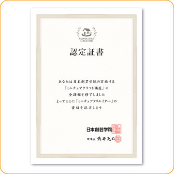 講座を修了すると「ミニチュアクリエイター」の資格が授与されます。この資格は、ミニチュア制作の知識と技術を習得したことを証明するものです。